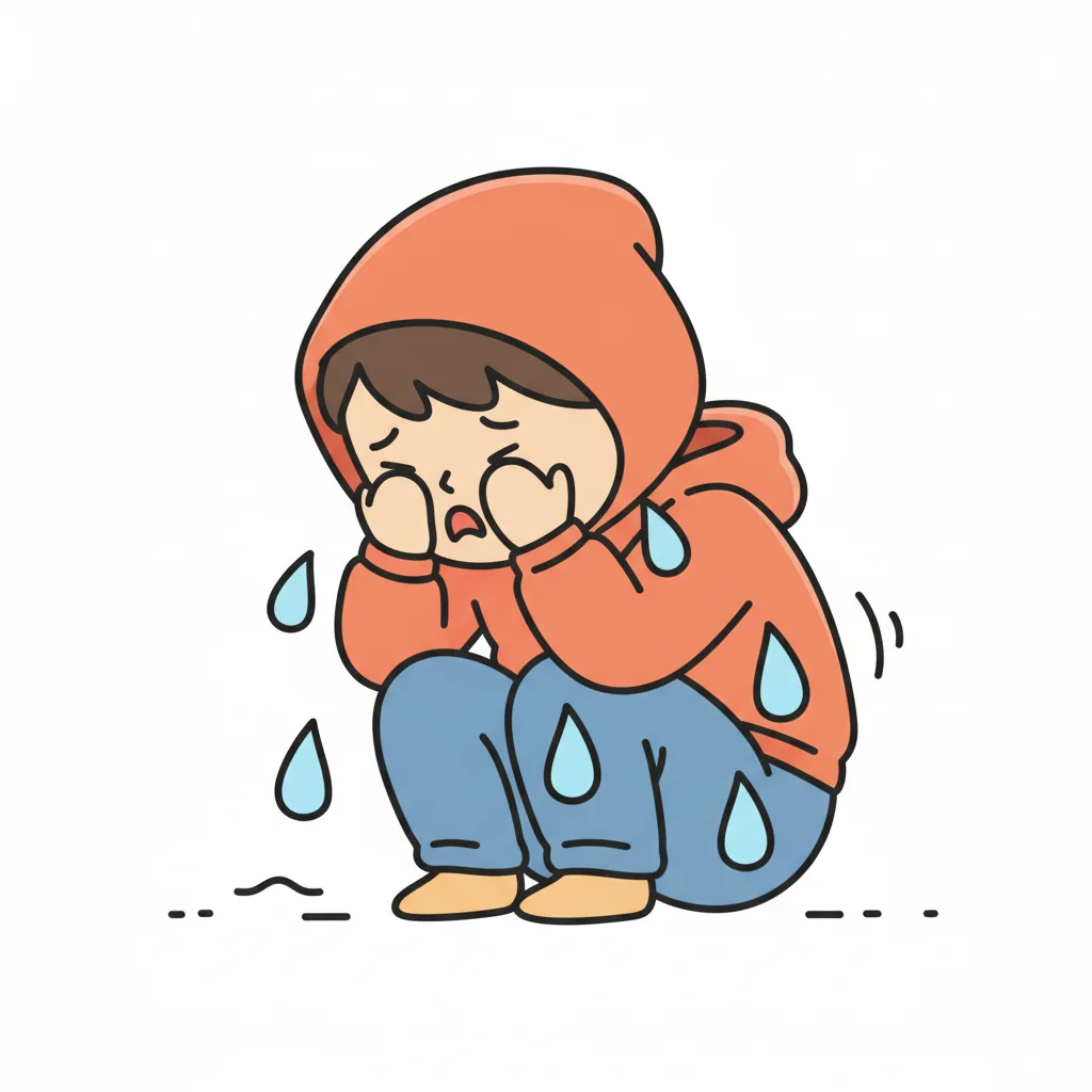 Ein trauriges Kind sitzt kreuzweise, umgeben von Tränen.