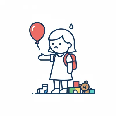 Ein traurig aussehendes Mädchen mit einem Luftballon und Spielzeug.