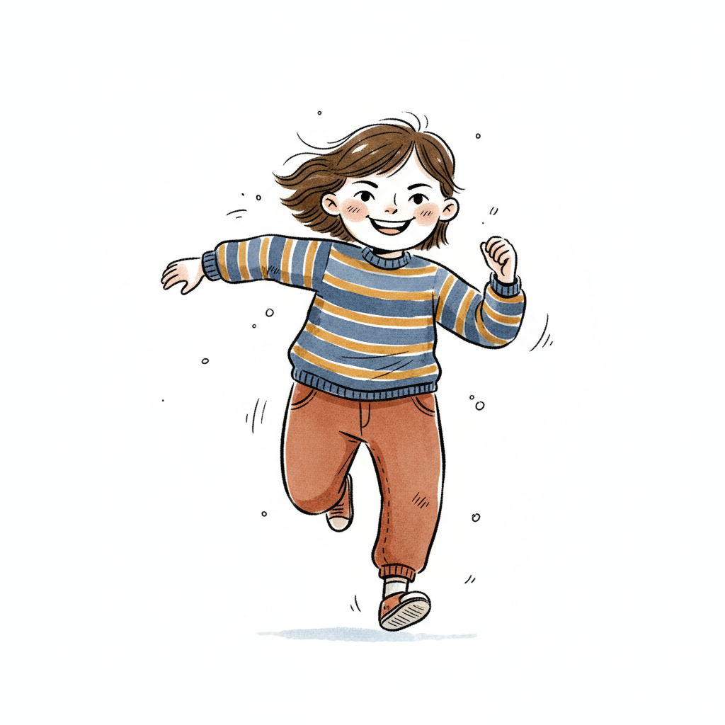 Niedliche, kindgerecht illustrierte Szene mit einem Kind oder einer Person als Hauptfigur, vor rein weißem Hintergrund, im frech-nordischen Aquarell-Skizzenstil. Klare, leicht wackelige Tuschekonturen, sichtbare Pinsel- und Strichtextur, dezente Schraffuren, weiche handgemalte Farbflächen in gedeckten Farben. Einfache, runde Formen. Keine harten Schatten, sondern sanfte, transparente Aquarellschichten. Leicht raue, handgezeichnete Linien statt glatter Vektorkanten. Subtile, vereinzelte Kritzelpunkte oder kleine Details im Hintergrund (wie Pünktchen oder feine Striche), aber keine echte Umgebung oder Landschaft. Die Figur ist mittig zentriert. Insgesamt charmant, humorvoll, warm und handgemacht wirkend. WICHTIG: Das Bild darf ABSOLUT KEINEN TEXT, KEINE BUCHSTABEN und KEINE ZAHLEN enthalten.