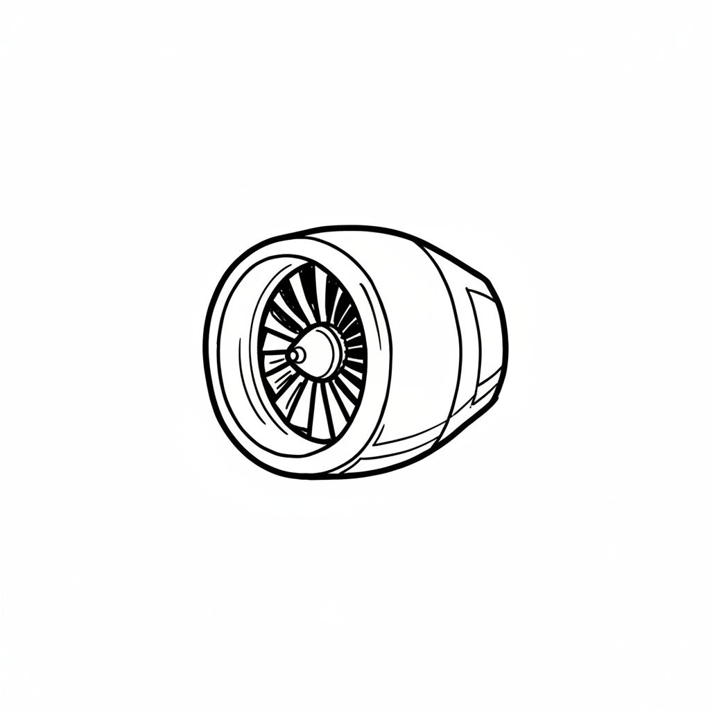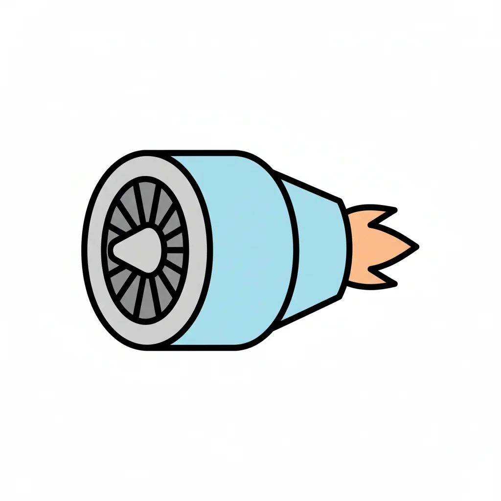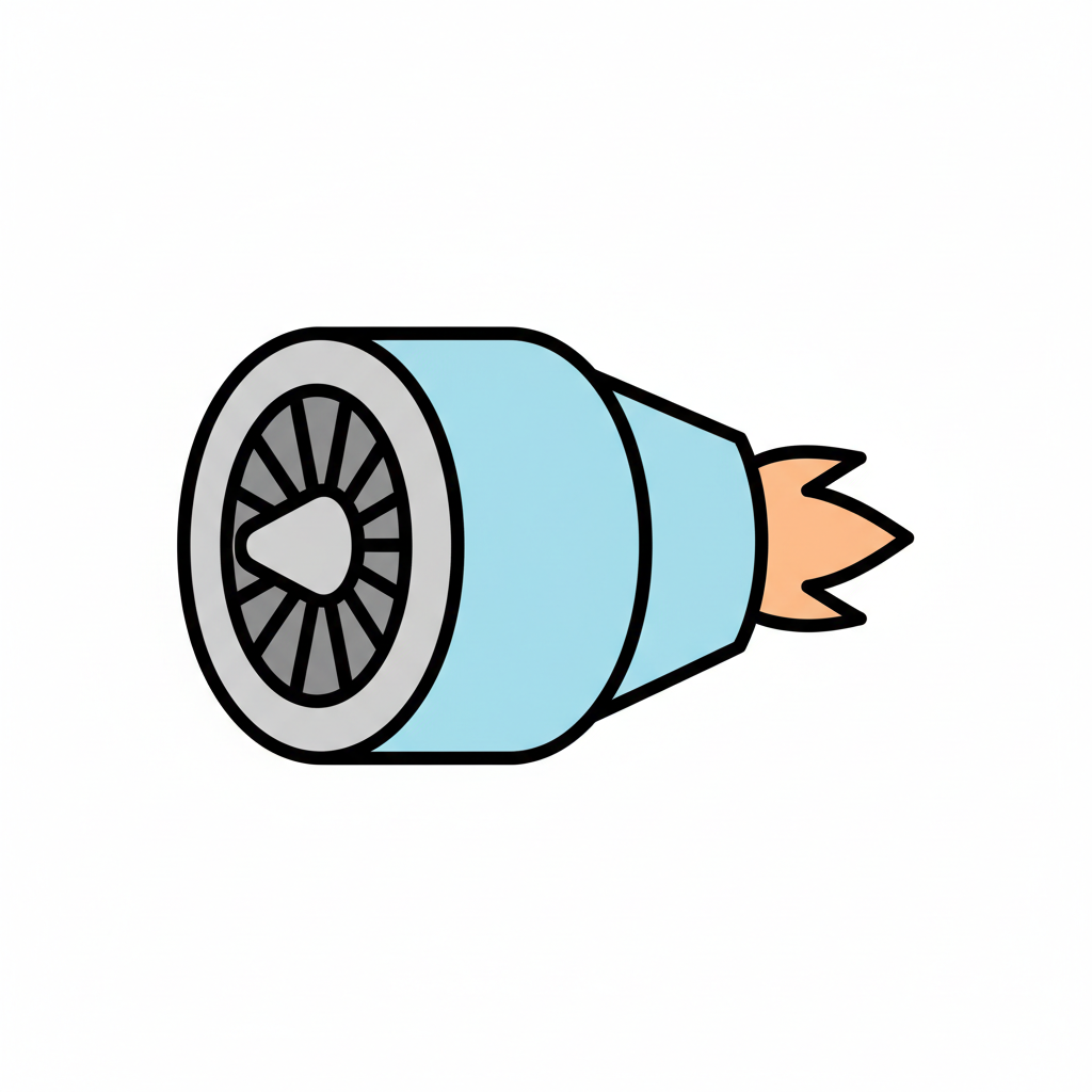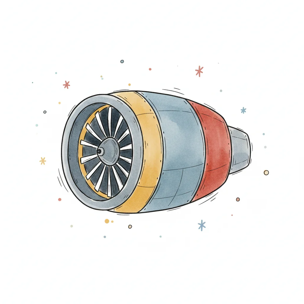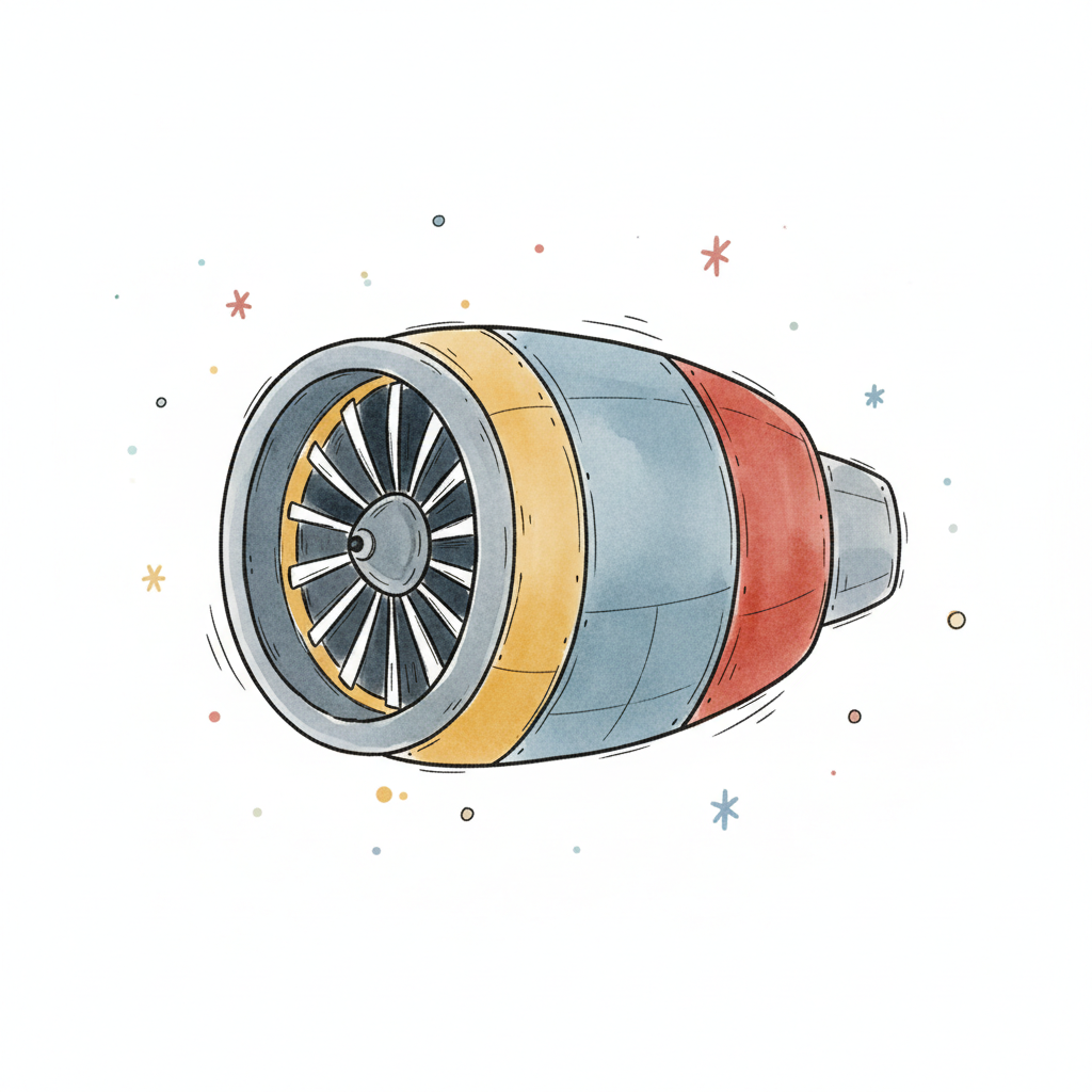 Illustration eines bunten Flugzeugtriebwerks im Cartoon-Stil mit Turbine und Heckflossen.
