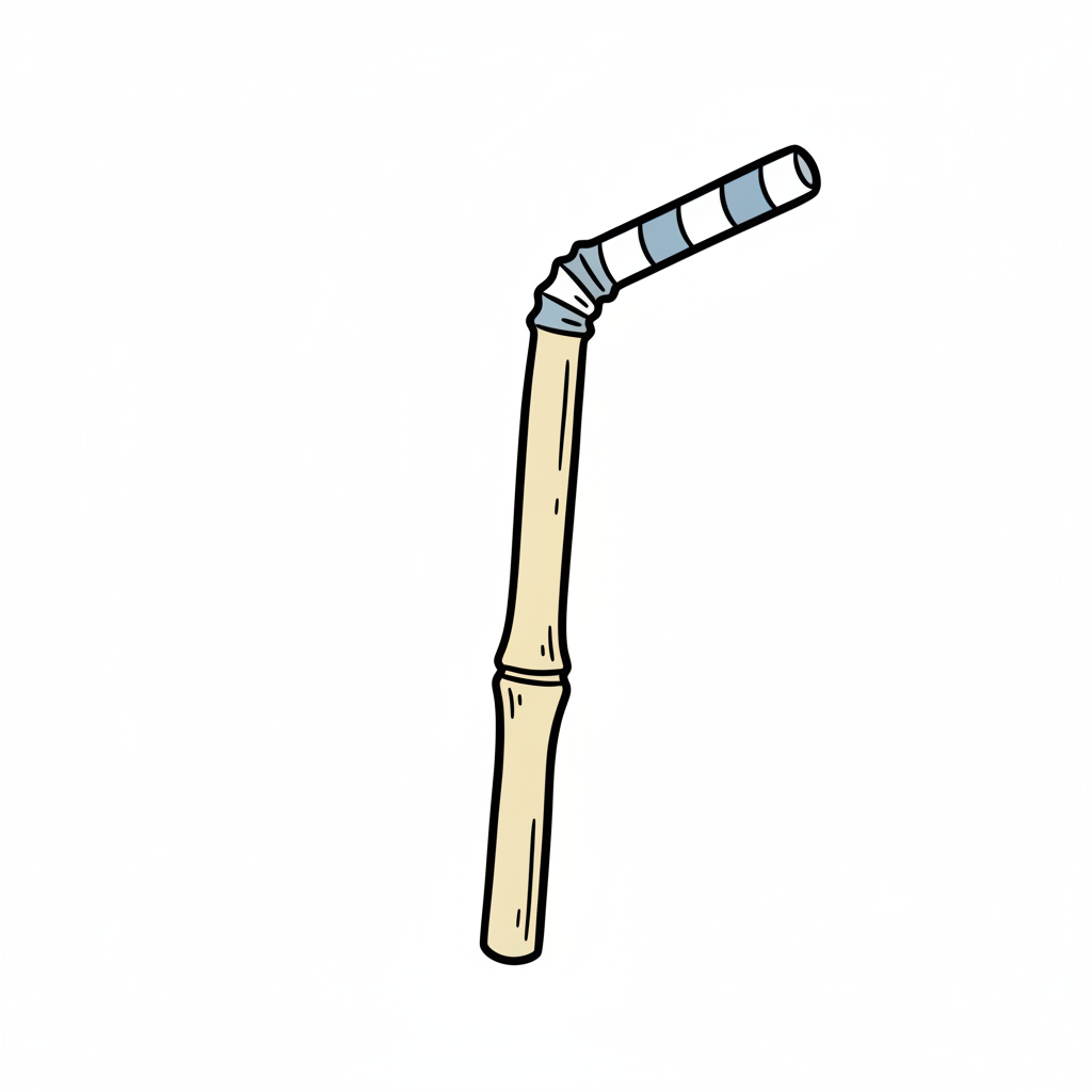 Eine gebogene Trinkhalm aus Holz mit einem gestreiften Ende.