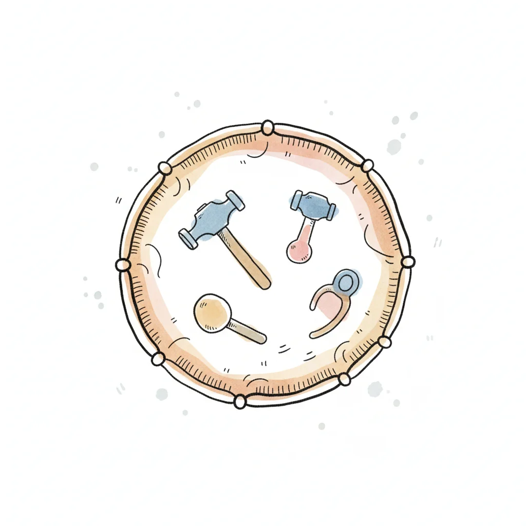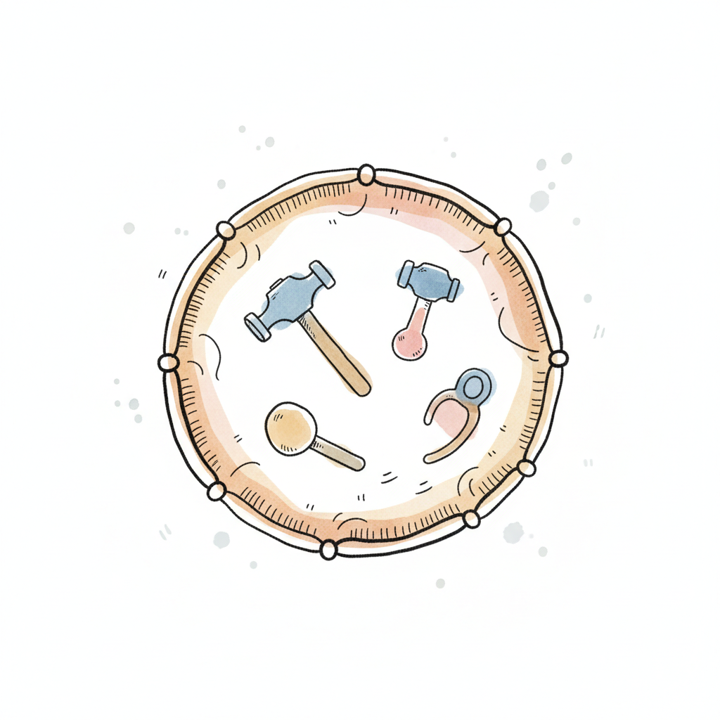 Bunte, handgezeichnete Werkzeuge (Hämmer, Zange) in einem runden, strukturierten Rahmen.