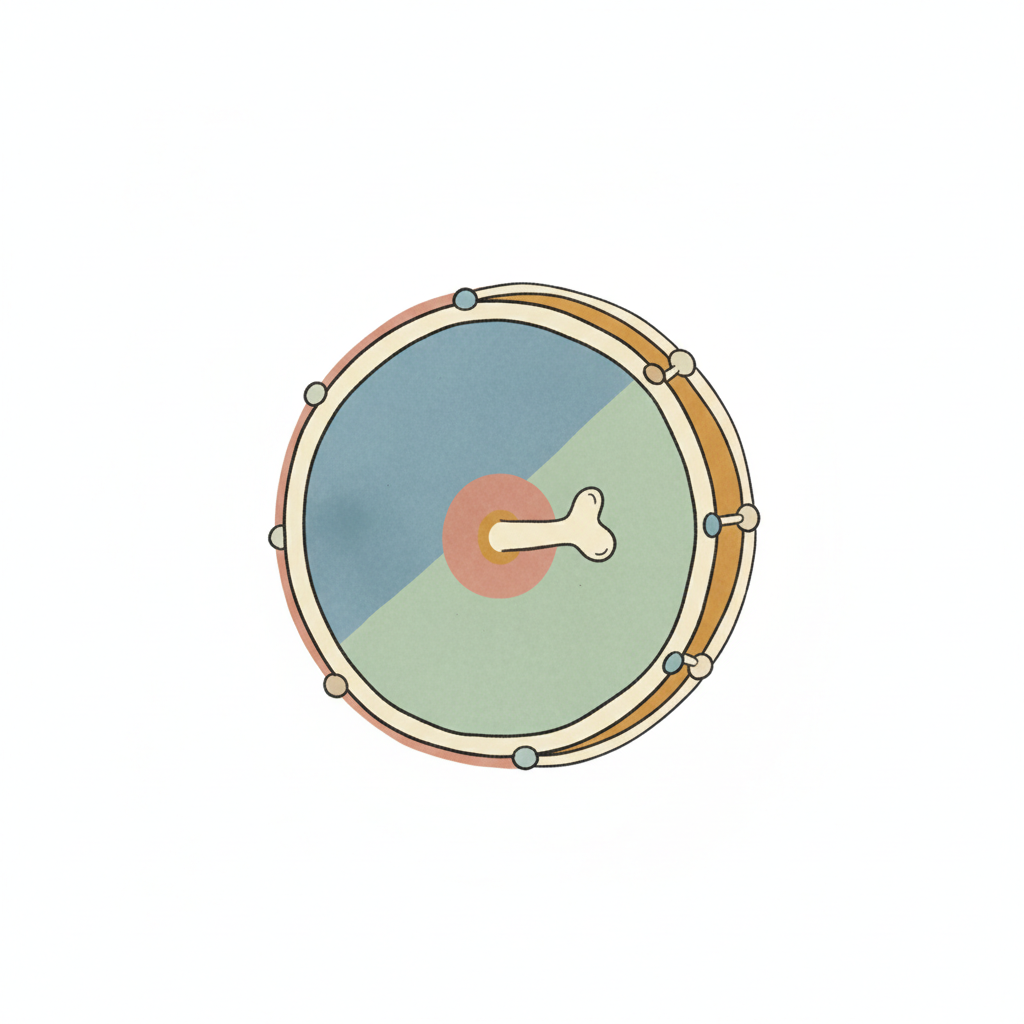 Bunte Illustration einer Trommel von oben mit einem Knochen auf der farbigen Oberfläche.