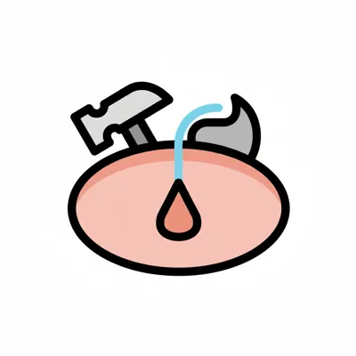 Icon: Hammer trifft rosa Oberfläche, aus der ein blauer Schlauch mit rotem Tropfen kommt.