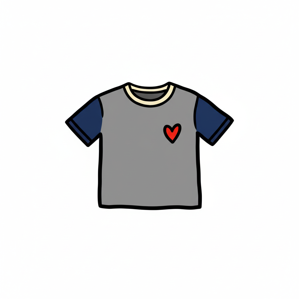 Graues T-Shirt mit blauen Ärmeln und einem roten Herz auf der Brust.