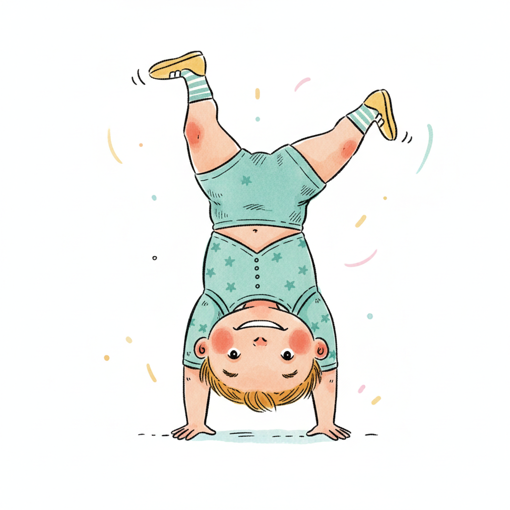 Ein fröhliches Kind macht einen Handstand und lächelt.