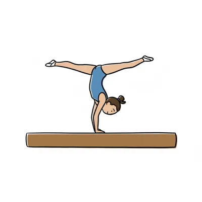 Mädchen balanciert auf einem Schwebebalken in einer akrobatischen Pose.