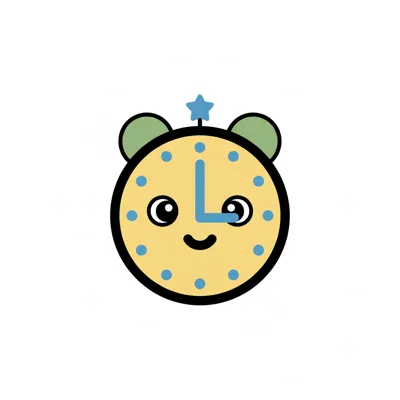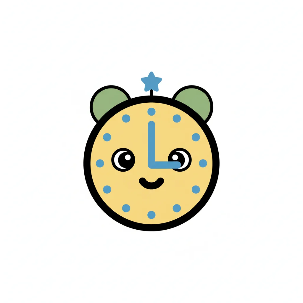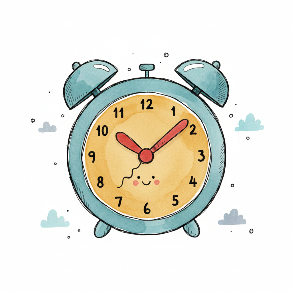 Eine bunte, handgezeichnete Uhr im Cartoon-Stil zeigt 10 Uhr 10 Minuten an. Hellblau und Creme.