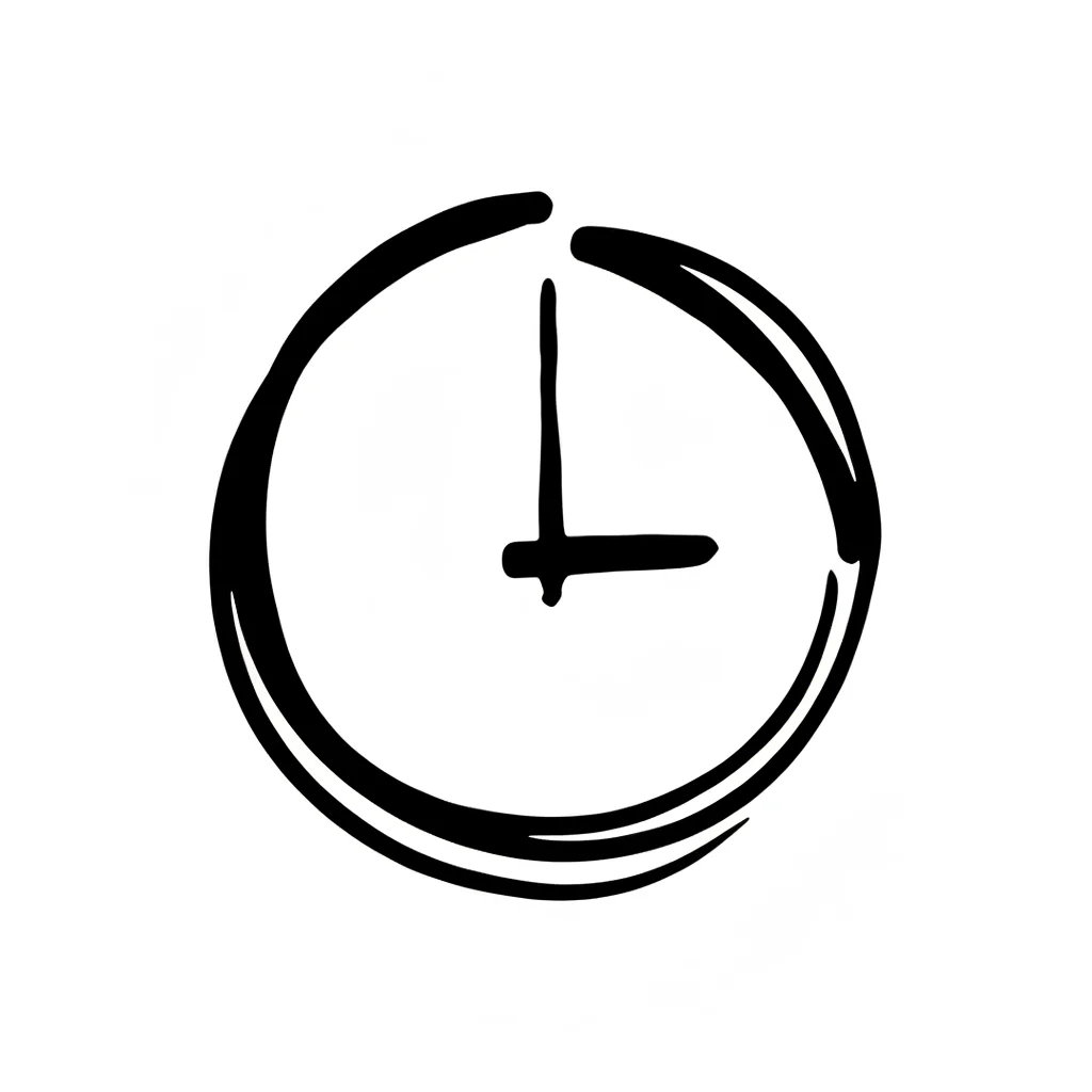 Handgezeichnetes Uhrensymbol in Schwarz-Weiß, das 3 Uhr anzeigt.