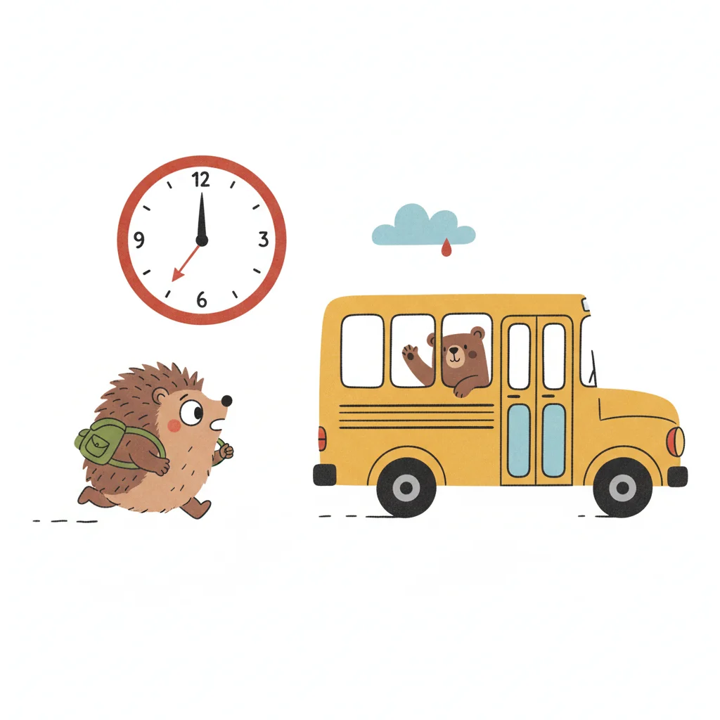 Ein Igel eilt mit Rucksack zum Schulbus, aus dem ein Bär winkt. Die Uhr zeigt 7 Uhr.