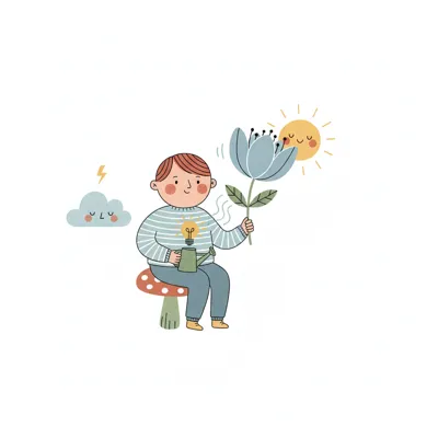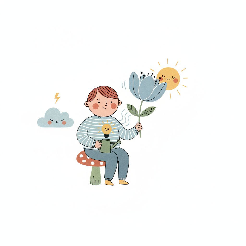 Junge gießt Idee, hält Blume. Sonne lacht, Wolke schläft. Kreativität & Natur.