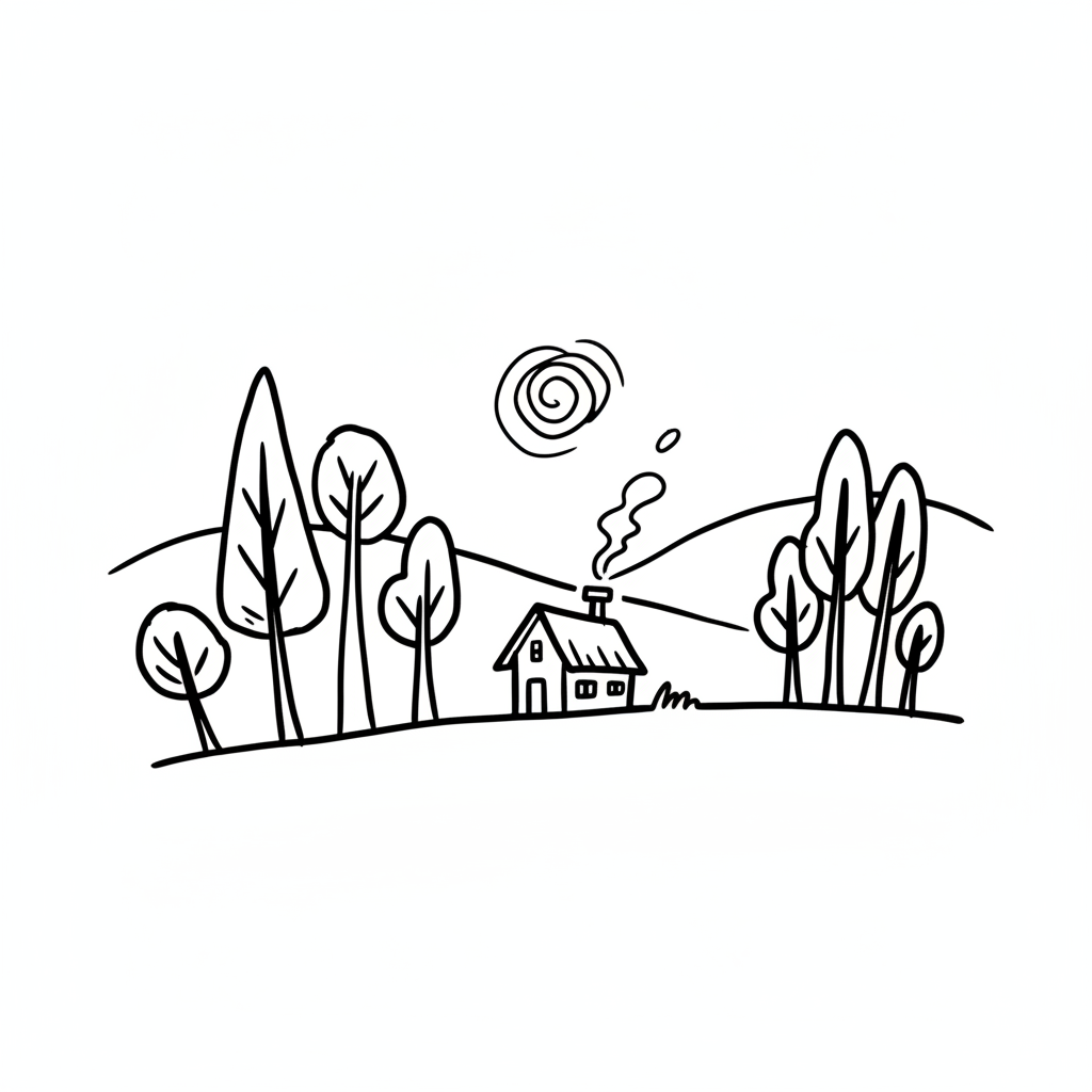 Stilisierte Schwarz-Weiß-Zeichnung eines Hauses mit rauchendem Schornstein, umgeben von Bäumen und Hügeln.