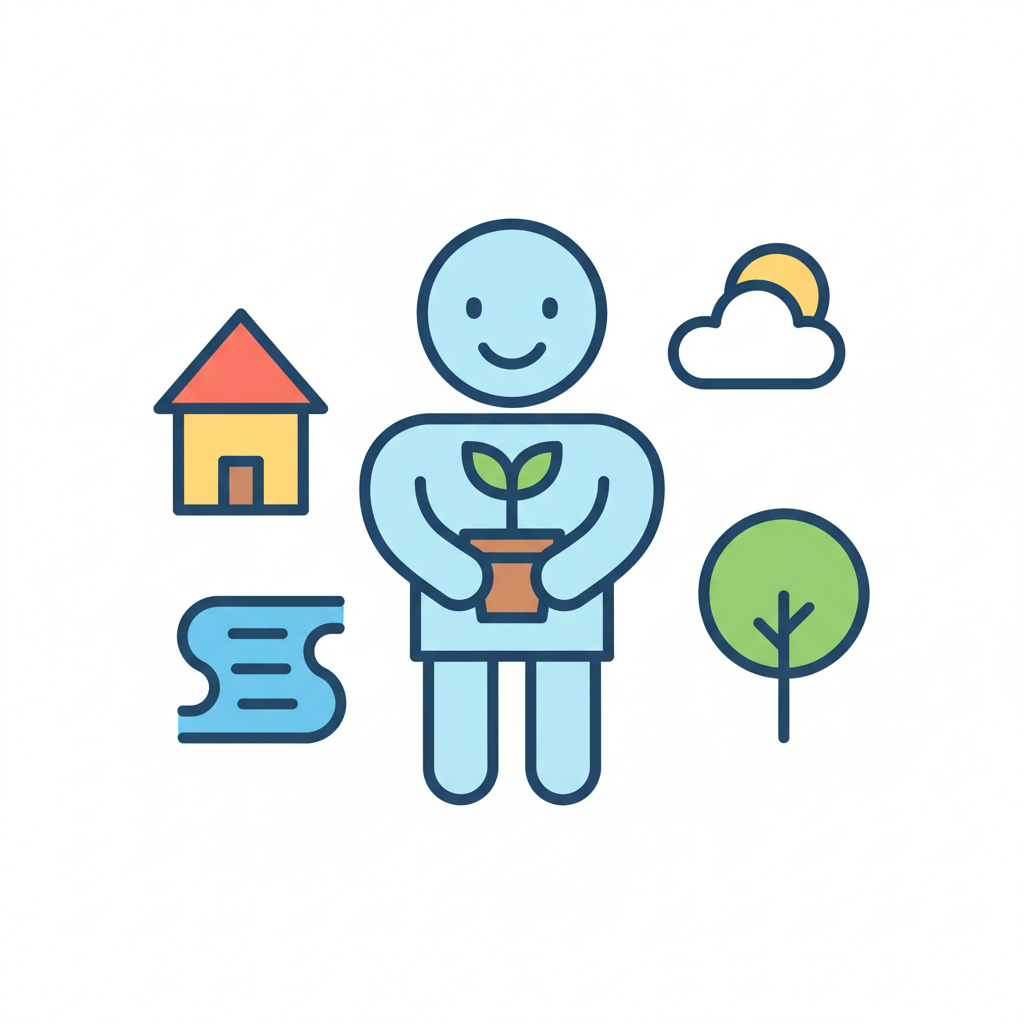 Stilisierte Person hält Pflanze, umgeben von Haus, Fluss, Baum und Sonne. Symbolisiert Naturverbundenheit.