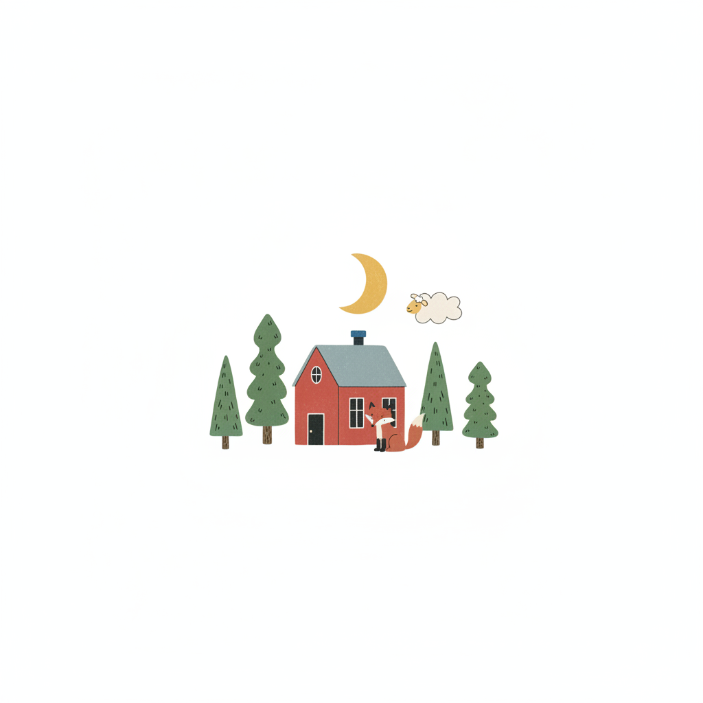 Niedliche Illustration eines roten Hauses mit Tannen, Fuchs, Mond und Biene auf weißem Grund.