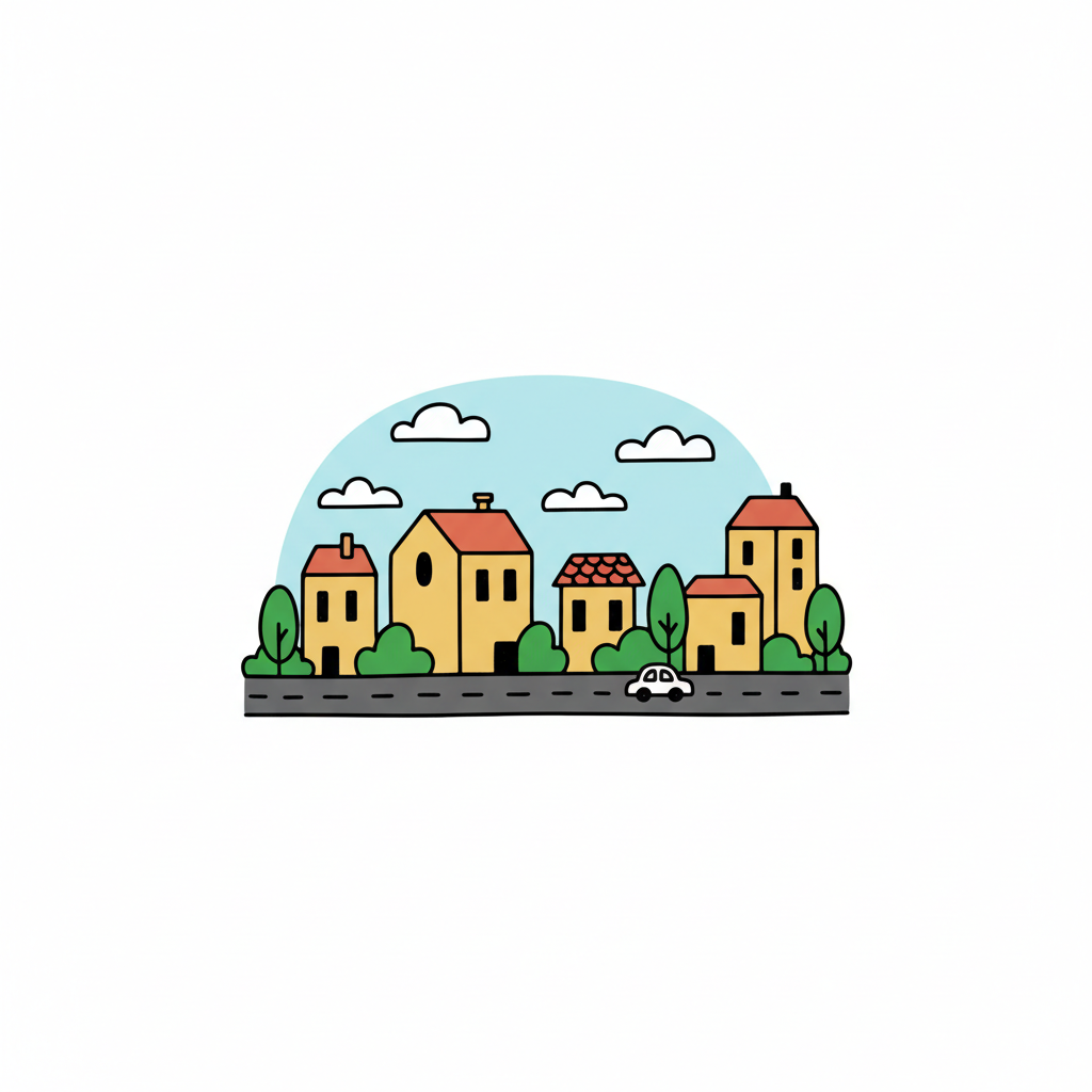 Cartoon-Stadtszene mit Häusern, Bäumen, Straße und einem Auto unter blauem Himmel.