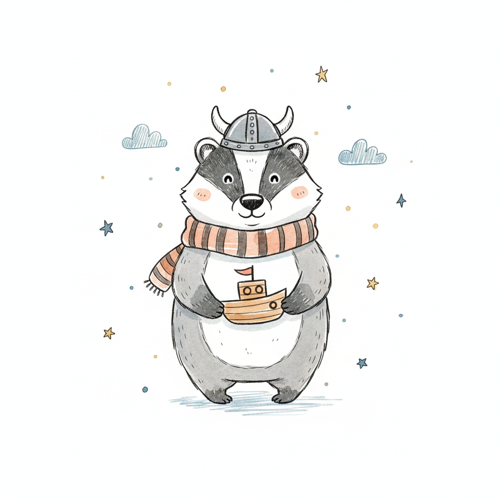Niedlicher Dachs mit Wikingerhelm, Schal und Holzboot, umgeben von Sternen und Wolken.