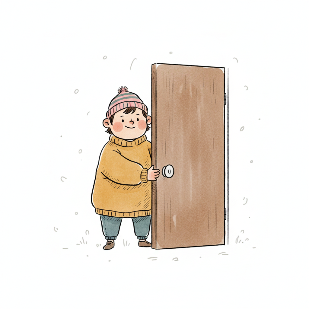 Ein lächelndes Kind in Winterkleidung öffnet eine Holztür in einer verschneiten Umgebung.