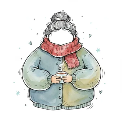 Gemütliche Person mit Dutt, dickem Schal und Mantel hält eine dampfende Tasse in winterlicher Umgebung.