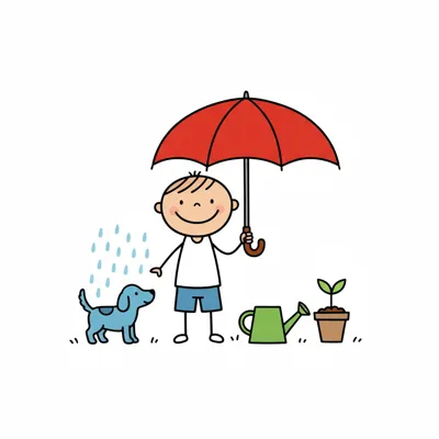 Fröhlicher Junge mit rotem Schirm schützt sich und seine Umgebung vor Regen, mit Hund und Pflanze.