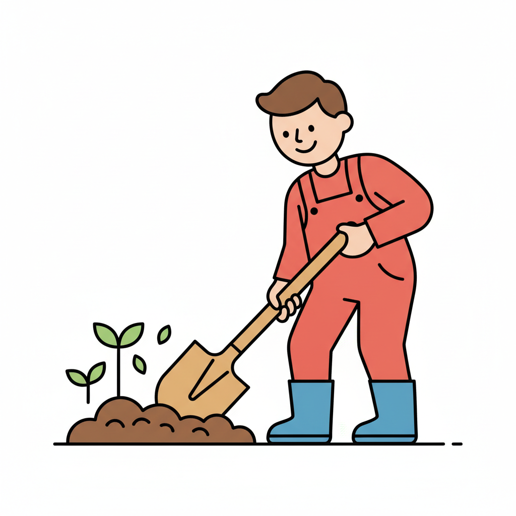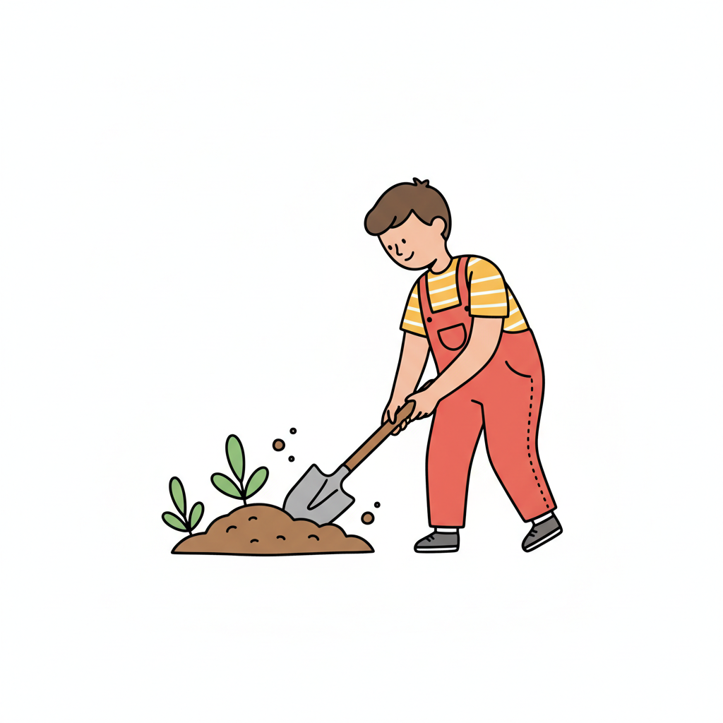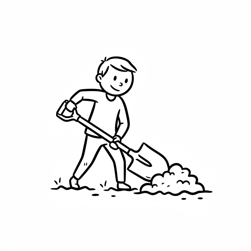 Ein lächelnder Cartoon-Junge gräbt mit einer Schaufel Erde um. Schwarz-weiß-Strichzeichnung.