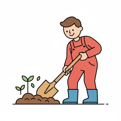 Ein lächelnder Gärtner in Latzhose schaufelt Erde neben jungen Pflanzen.