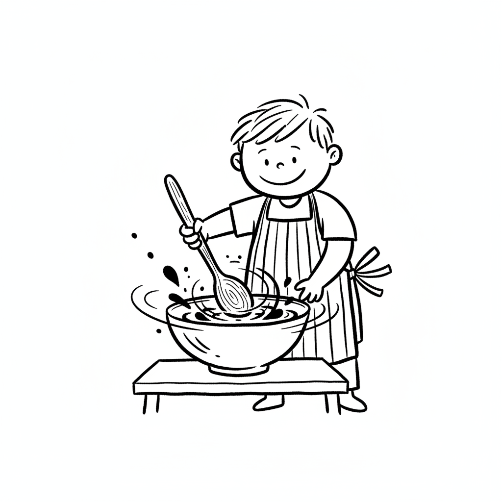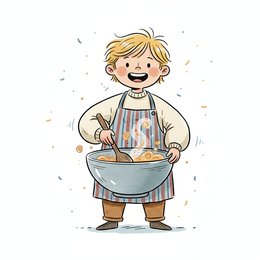 Ein Junge rührt fröhlich in einer großen Schüssel.