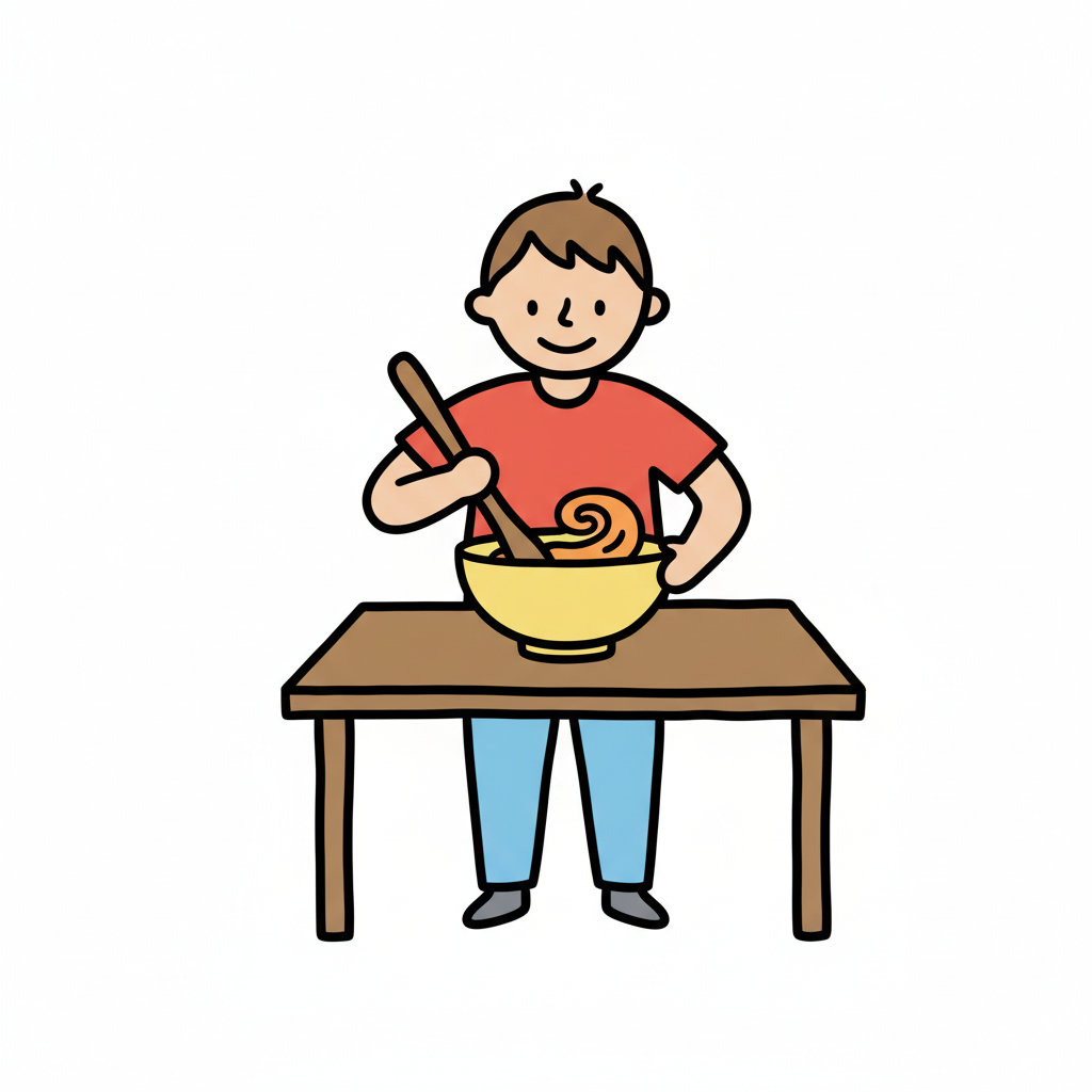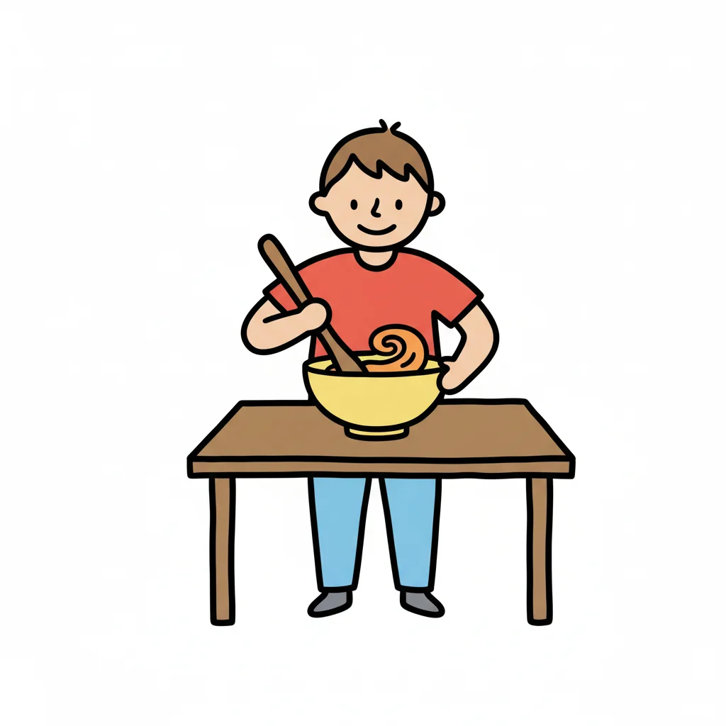 Ein Junge rührt Teig in einer Schüssel auf einem Tisch.