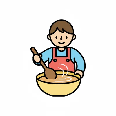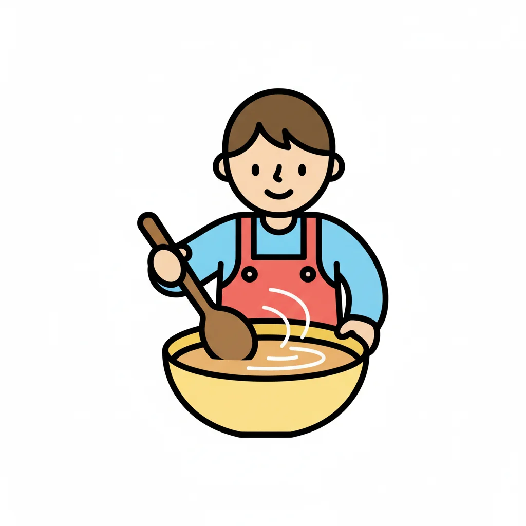Ein Junge rührt in einer großen Schüssel mit einem Holzlöffel.