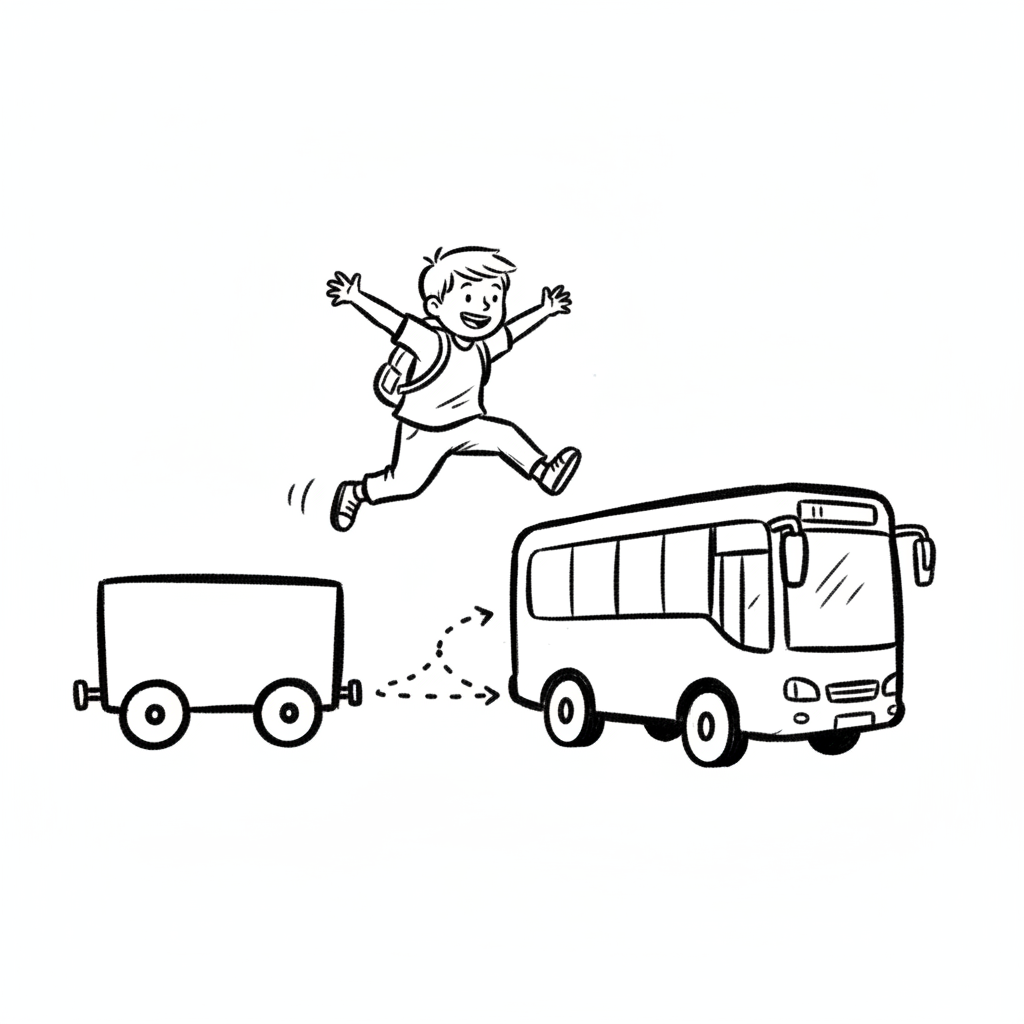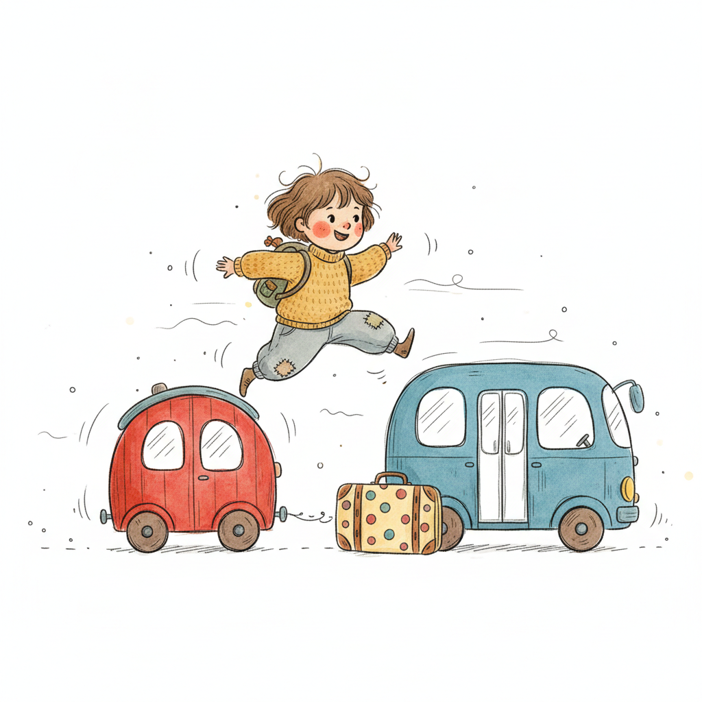 Ein Kind springt fröhlich von einem Wagen zu einem Bus, was einen Übergang darstellt.