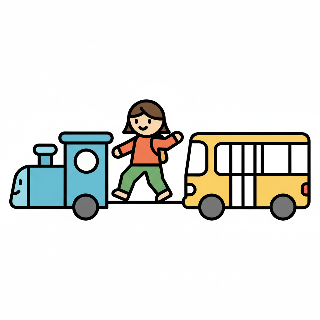 Ein lächelndes Kind mit Rucksack balanciert zwischen einem blauen Zug und einem gelben Bus.