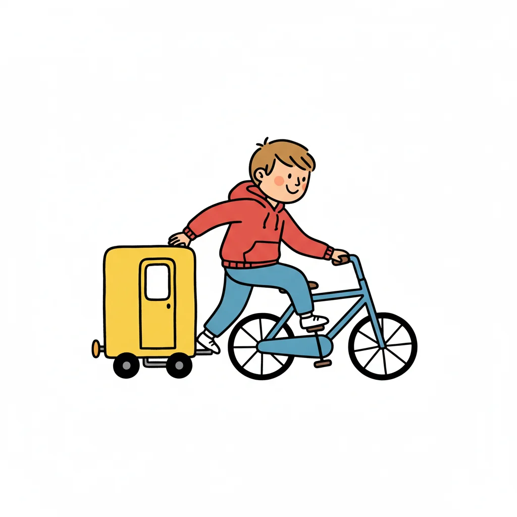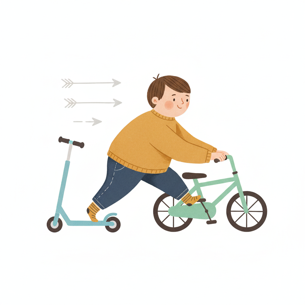 Ein Junge fährt Fahrrad und schiebt gleichzeitig einen Roller, mit Pfeilen, die Bewegung andeuten.