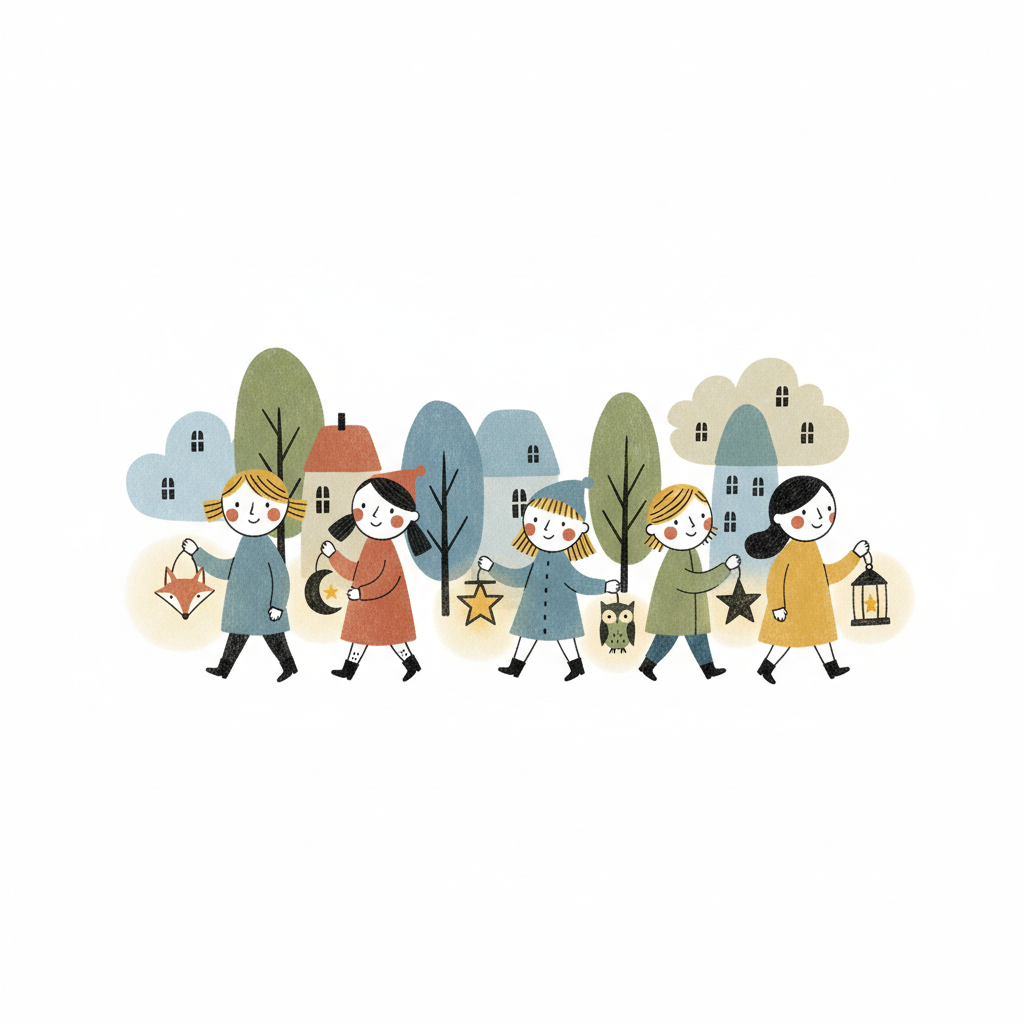 Gruppe von Mädchen mit Laternen, umgeben von Schneeflocken und Sternen.