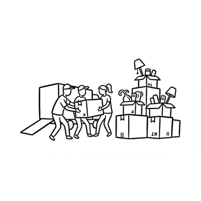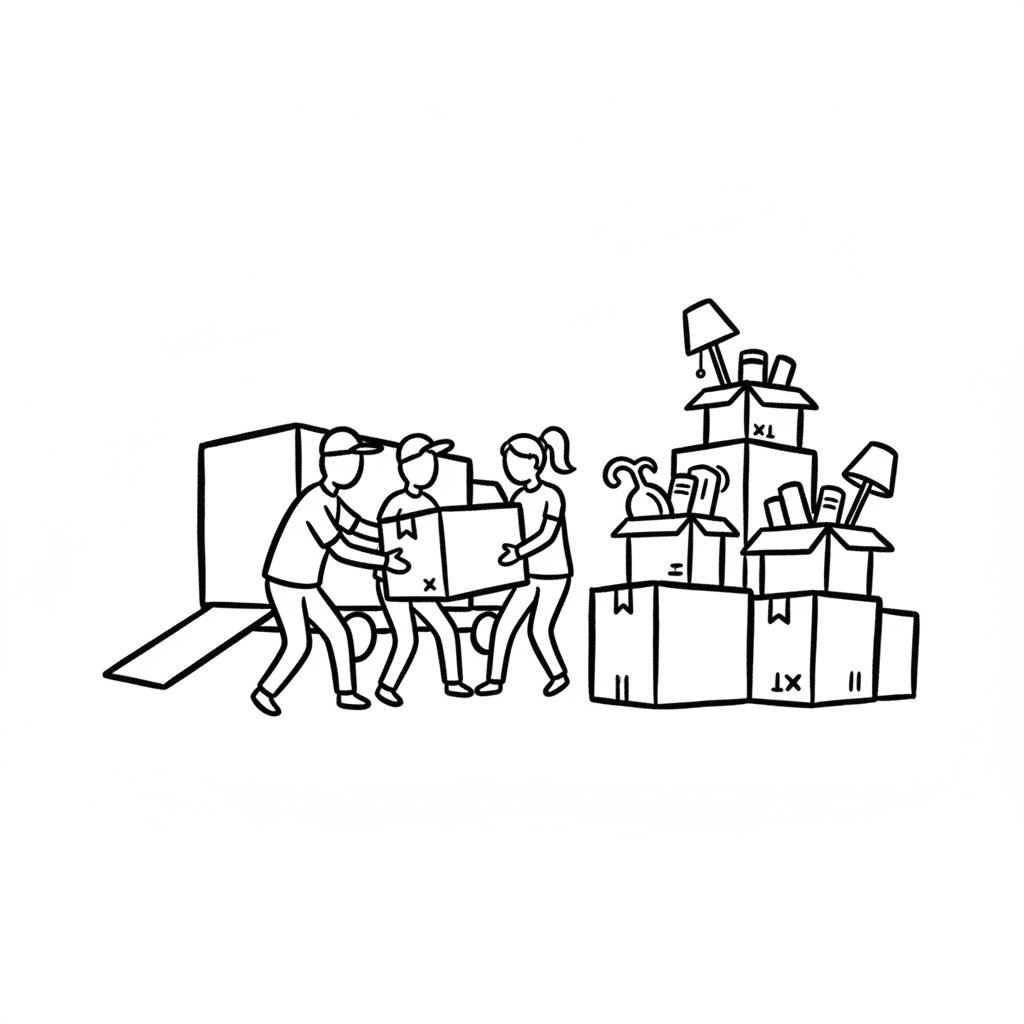 Drei Personen tragen eine Umzugskiste zu einem LKW, umgeben von weiteren Kartons.