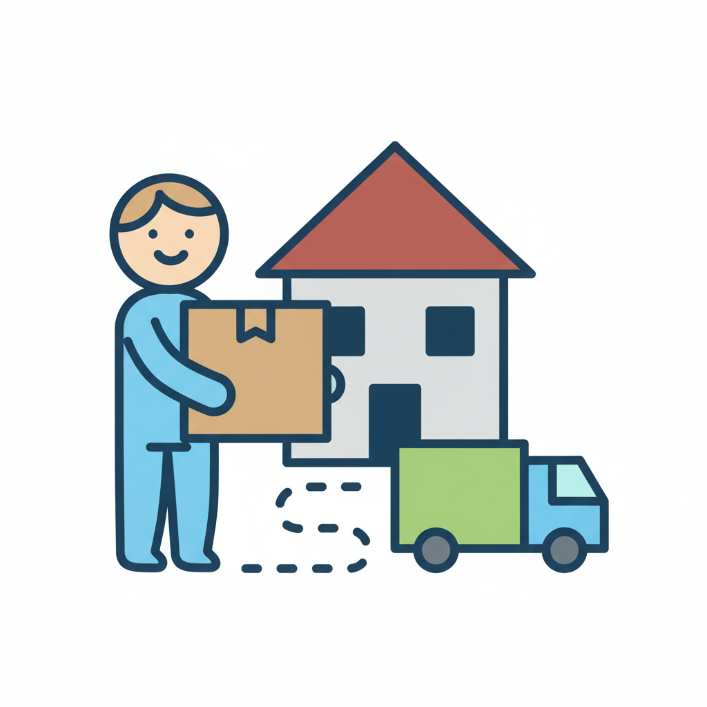 Person liefert Paket an Haus, mit Lieferwagen im Hintergrund. Symbol für Zustellung oder Umzug.