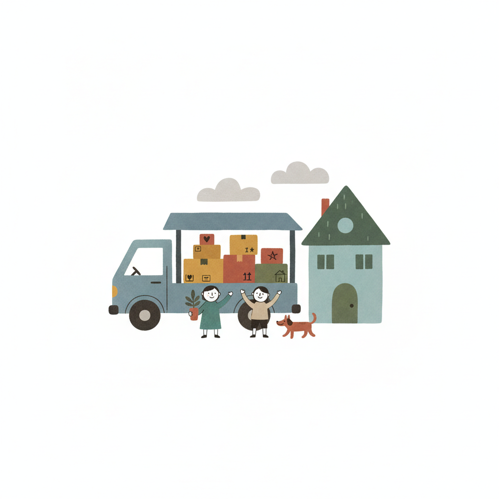 Fröhliche Familie zieht um: LKW voller Kartons, Haus, Kinder und Hund.