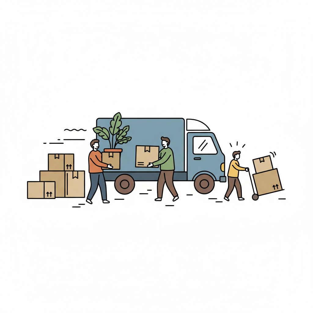 Menschen laden Umzugskartons und eine Pflanze in einen LKW. Einer hat Schwierigkeiten mit einer Sackkarre.