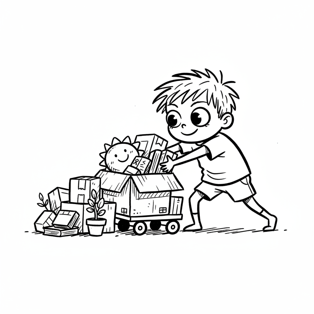 Ein lächelnder Junge schiebt einen Wagen voller Umzugskartons, Bücher und Pflanzen.