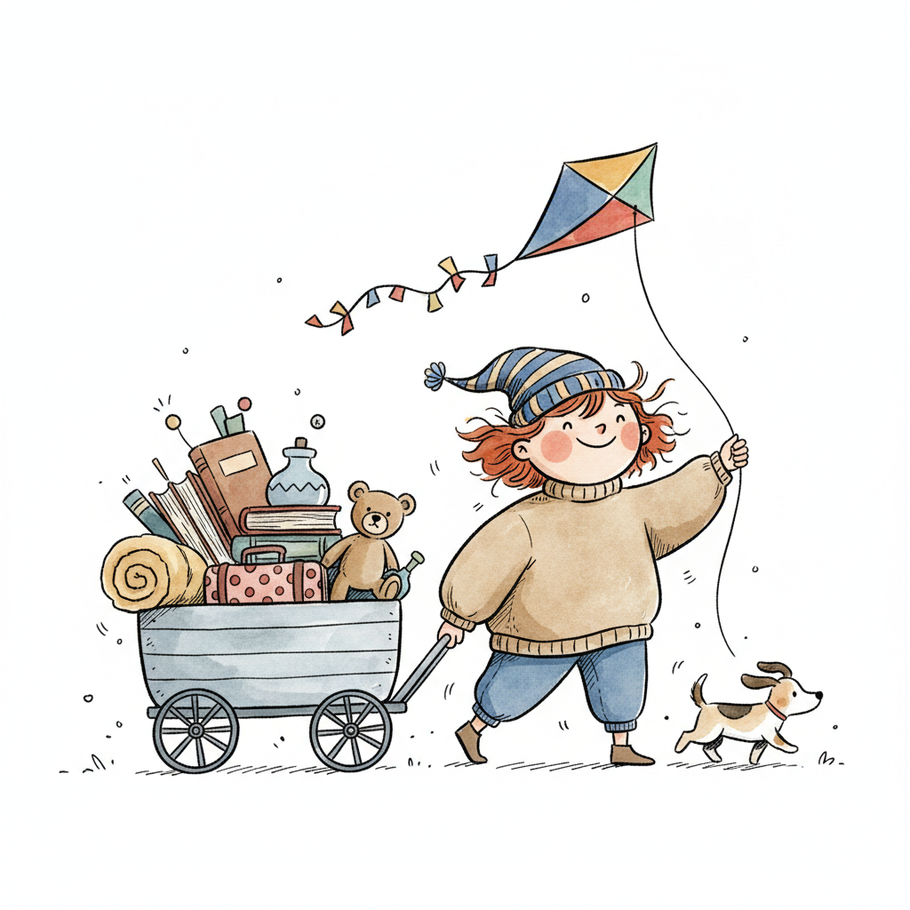 Ein lächelndes Kind zieht einen vollgepackten Wagen, lässt einen Drachen steigen und wird von einem Hund begleitet.
