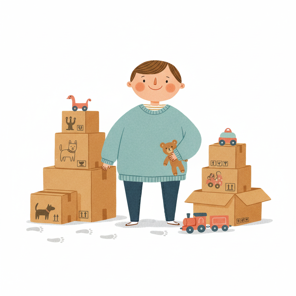 Ein lächelndes Kind mit Teddybär steht zwischen Umzugskartons voller Spielzeug.