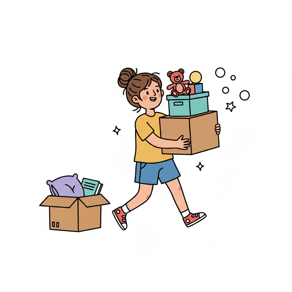 Mädchen packt Spielzeug-Giraffe in Umzugskarton, umgeben von Kisten und Spielsachen.