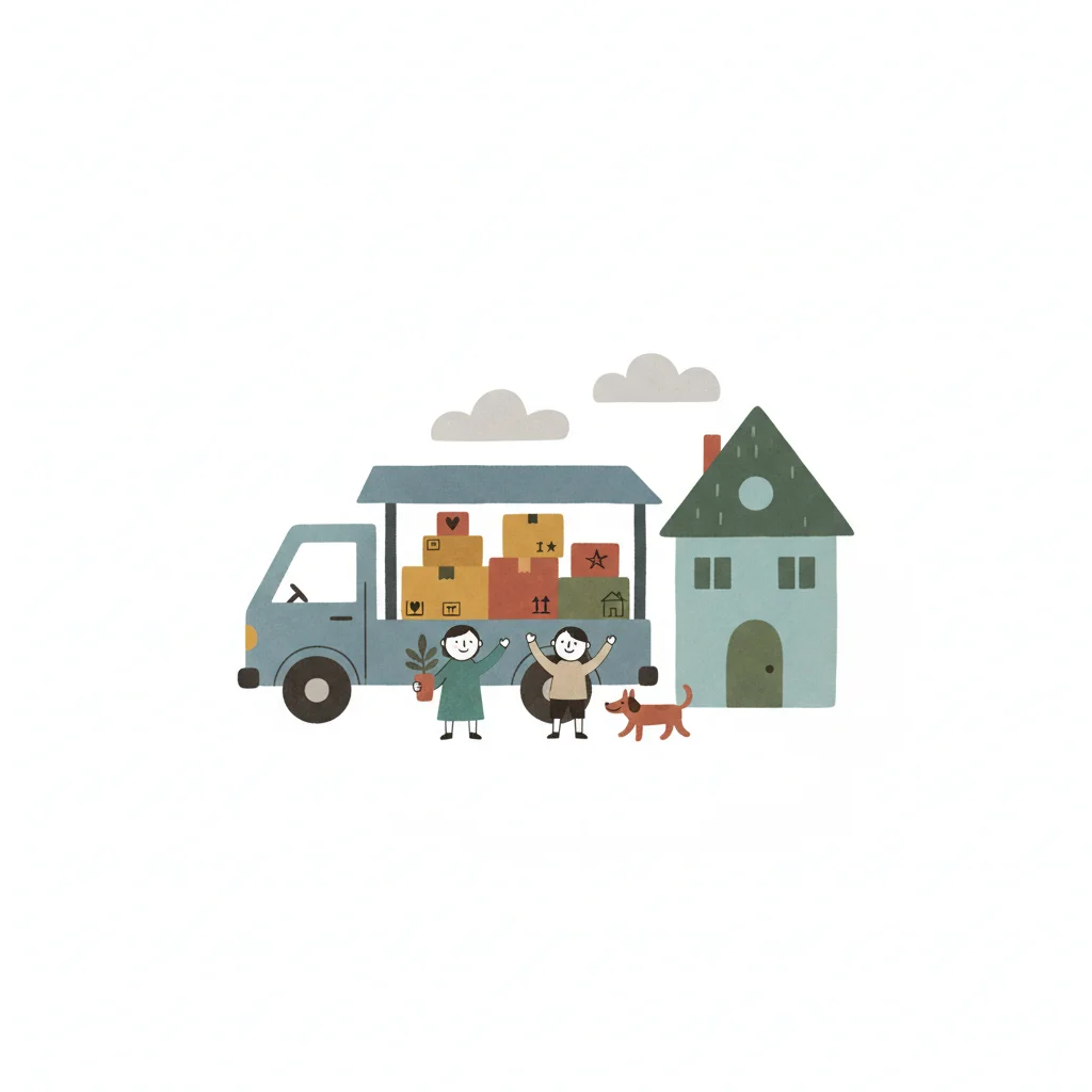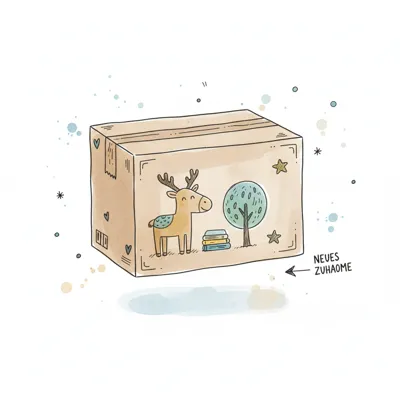 Illustrierte Umzugskiste mit Hirsch, Baum und Büchern, symbolisiert ein neues Zuhause.