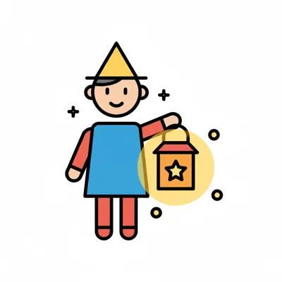 Niedliches Cartoon-Kind mit gelbem Spitzhut und Laterne mit Stern, bereit für einen Umzug.