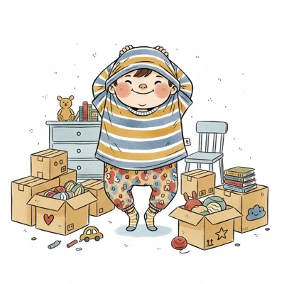 Niedliches Kind zieht gestreiftes Shirt an, umgeben von Umzugskartons und Spielzeug.