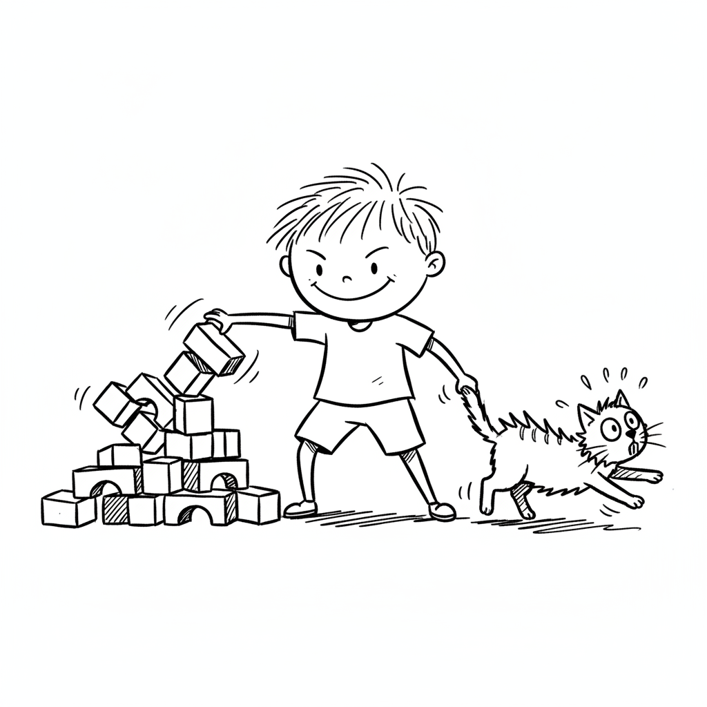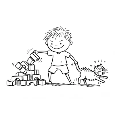 Ein lächelnder Junge zieht einer verängstigten Katze am Schwanz, während Bauklötze fallen.