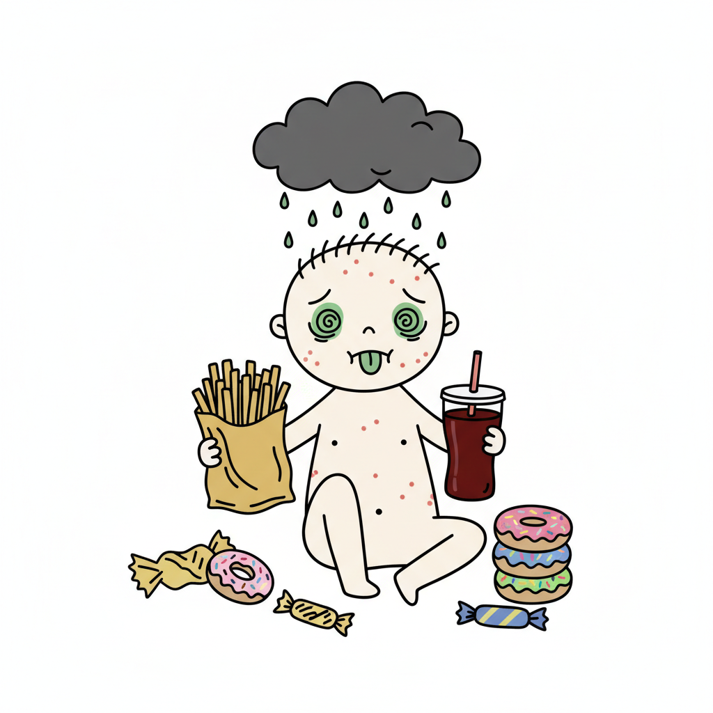Ein krankes Baby mit Fast Food und Süßigkeiten, symbolisiert die negativen Folgen ungesunder Ernährung.