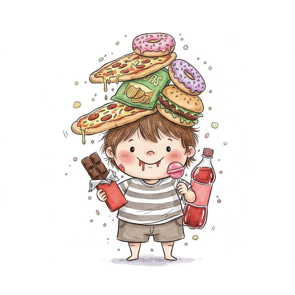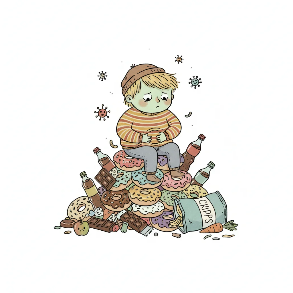 Trauriges Kind sitzt auf einem Berg ungesunder Lebensmittel, umgeben von Viren und Krankheitssymbolen.