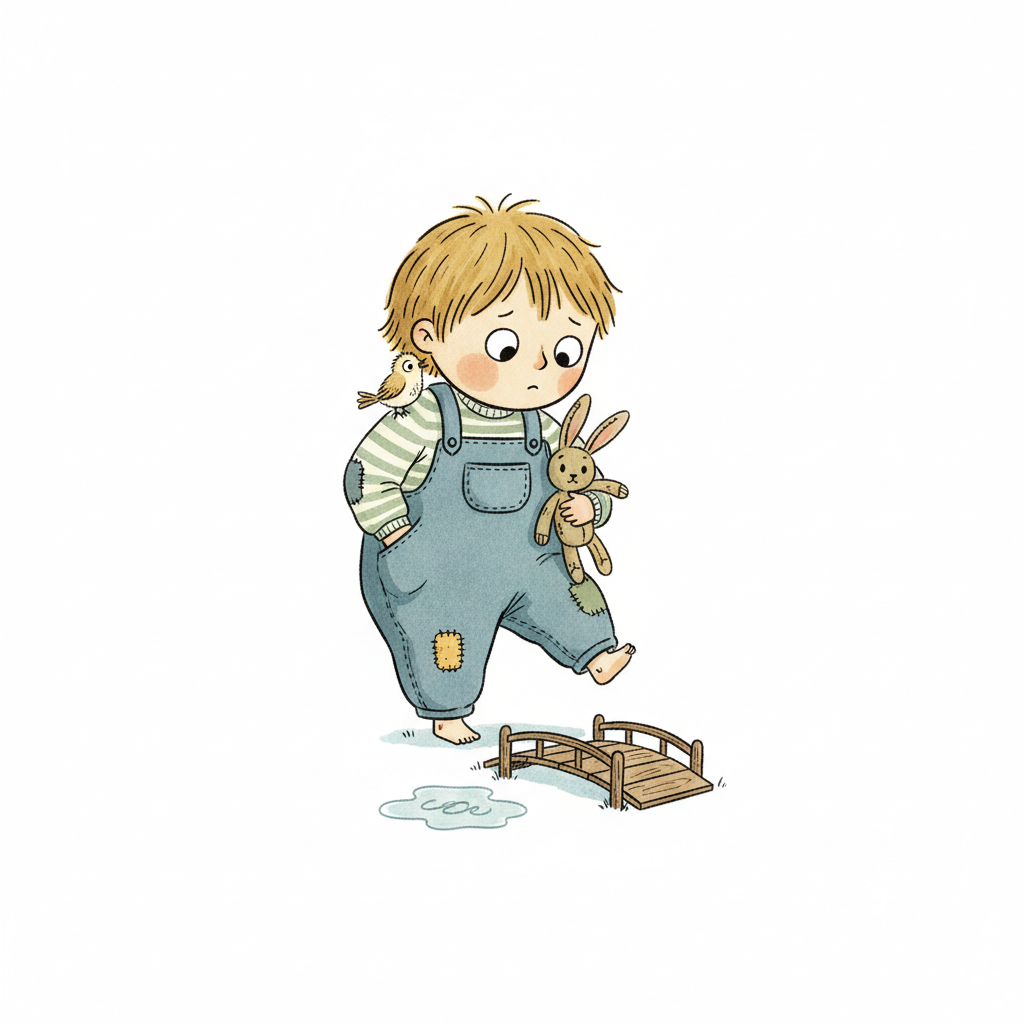 Kind mit Vogel und Hase blickt besorgt auf kleine Brücke über Pfütze.