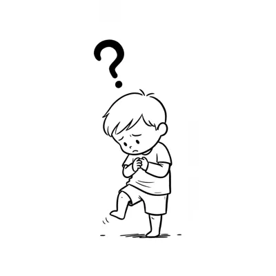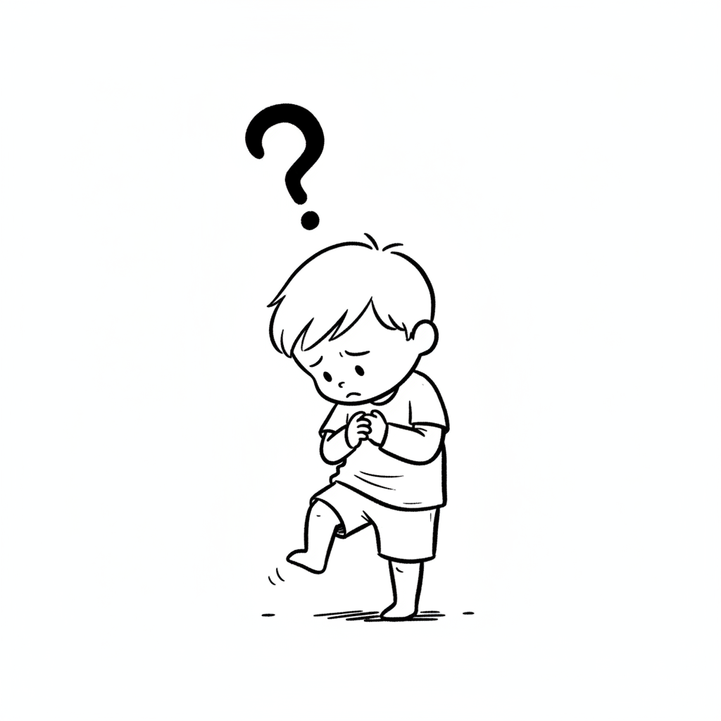 Schwarz-weiße Illustration eines Jungen, der unsicher und traurig mit einem Fragezeichen über dem Kopf dasteht.