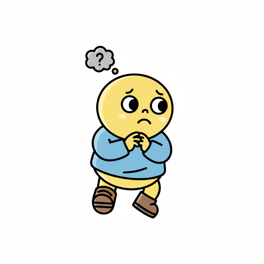 Traurige gelbe Cartoonfigur mit Fragezeichen über dem Kopf und gefalteten Händen.