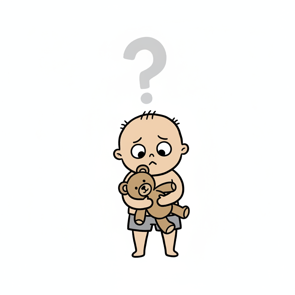 Ein trauriges Cartoon-Baby hält einen Teddybär, mit einem Fragezeichen über dem Kopf.